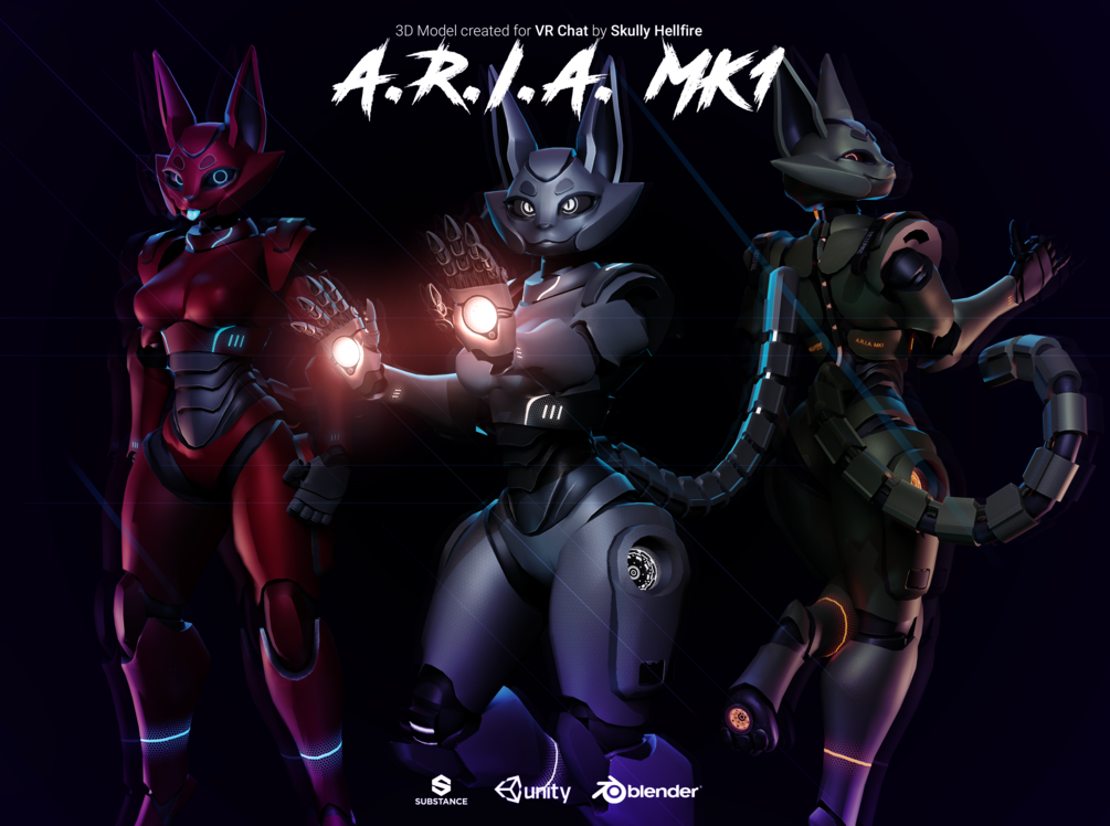 An original mech design by Skully Hellfire. ARIA was modelled in Blender 2.9+ and textured in Substance Painter. This avatar uses the Poiyomi Toon Shader.