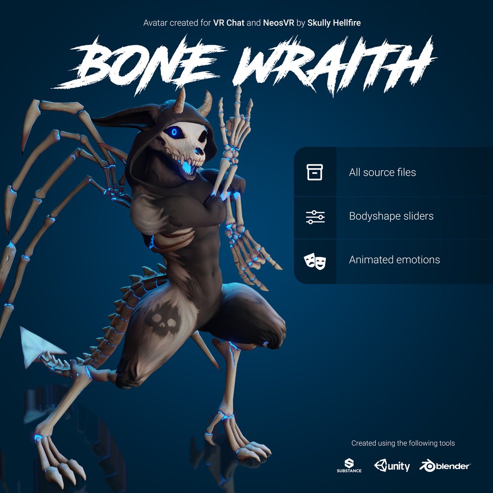An original species design by Skully Hellfire. The Bone Wraith was modelled in Blender 2.9+ and textured in SSP. This avatar uses the Poiyomi Toon Shader.